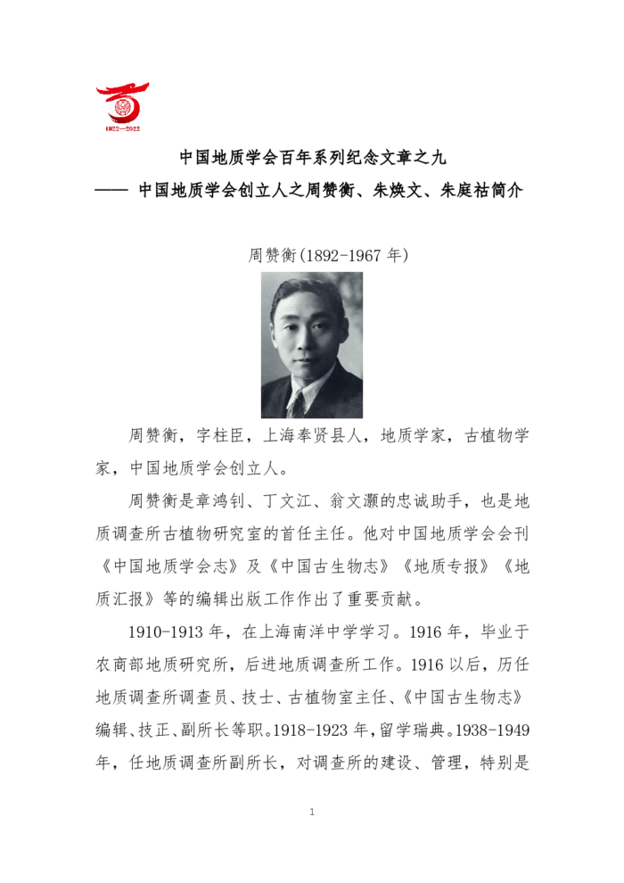中国地质学会百年系列纪念文章之九——中国地质学会创立人之周赞衡、朱焕文、朱庭祜简介