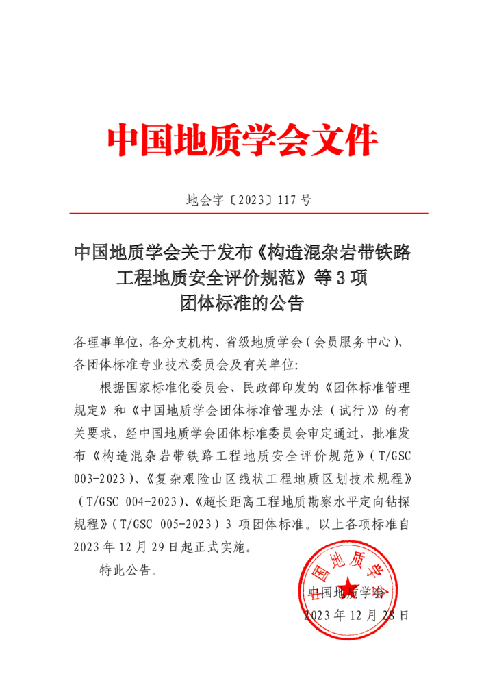 中国地质学会关于发布《构造混杂岩带铁路工程地质安全评价规范》等3项团体标准的公告
