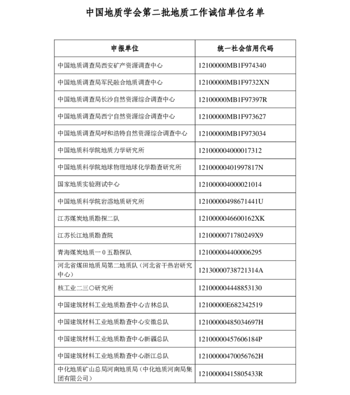 中国地质学会地质工作诚信单位(第二批)正式向社会公布