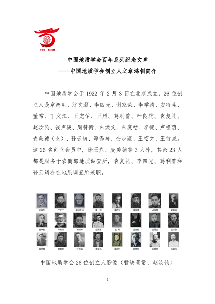 中国地质学会百年系列纪念文章之二中国地质学会之创立人章鸿钊简介