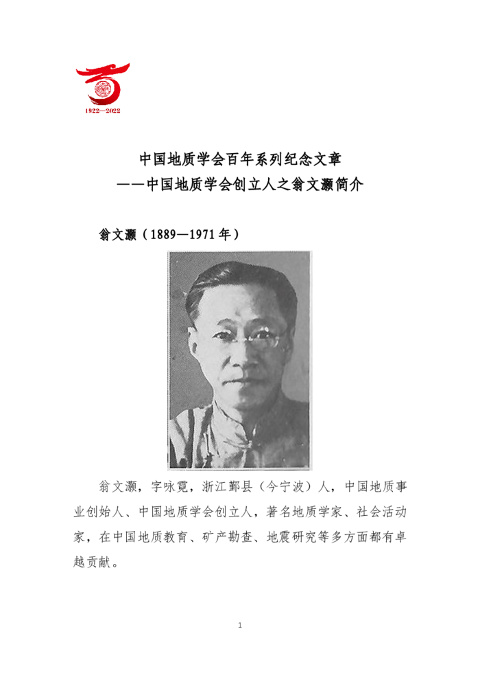 中国地质学会百年系列纪念文章之三中国地质学会之创立人翁文灏简介