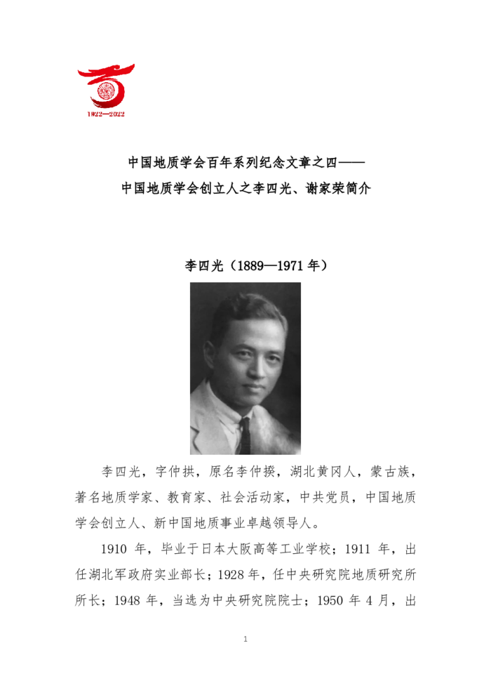 中国地质学会百年系列纪念文章之四——中国地质学会创立人之李四光、谢家荣简介