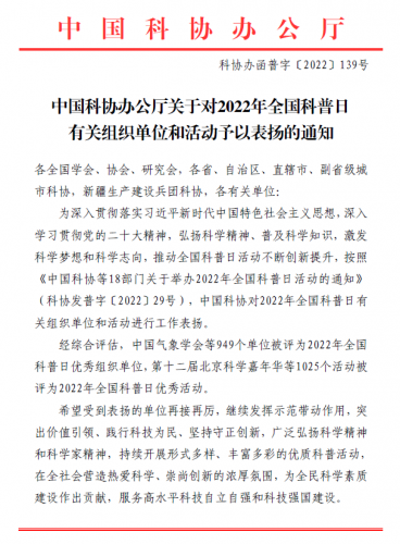 浙江省地质学会荣获中国科协2022年全国科普日优秀组织单位 2022-12-28