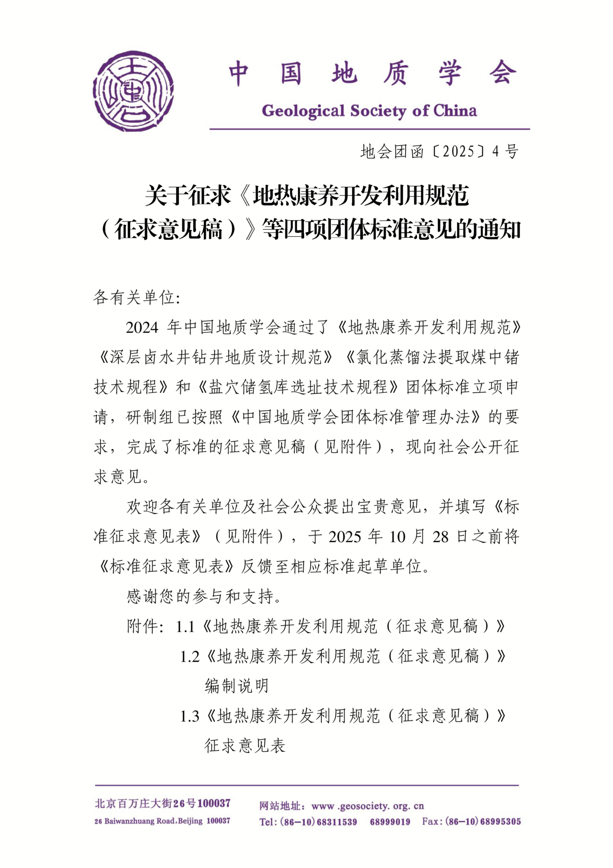 关于征求《地热康养开发利用规范(征求意见稿)》等四项团体标准意见的通知