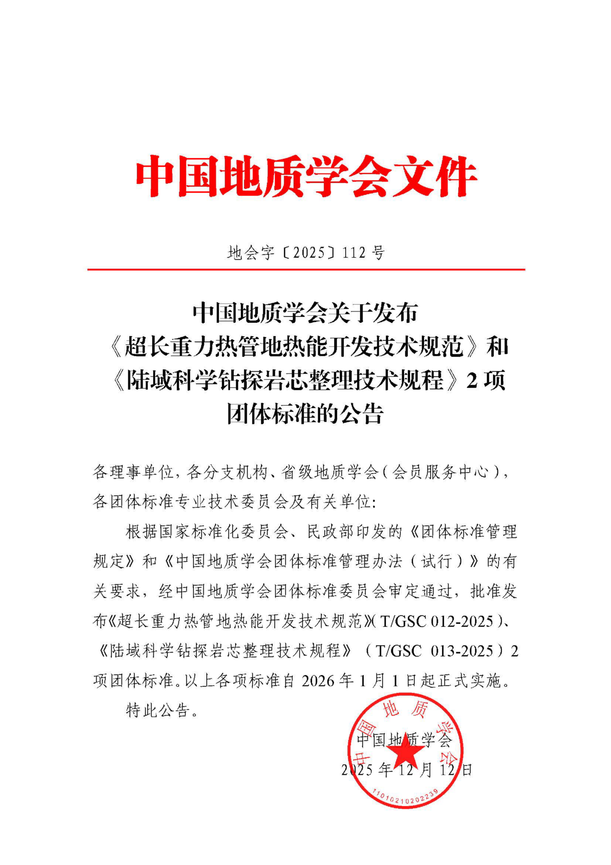 中国地质学会关于发布《超长重力热管地热能开发技术规范》和《陆域科学钻探岩芯整理技术规程》2项团体标准的公告