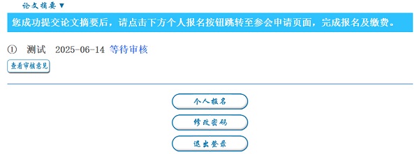 | 论文等待审核过程中,您可以点击“个人报名”按钮进行参会注册缴费。 |